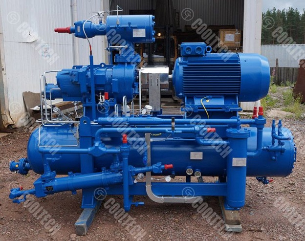 Аммиачный (R717) компрессорный агрегат на базе винтового компрессора Howden холодопроизводительностью 397 кВт. Режим работы -10/+35 °C.
