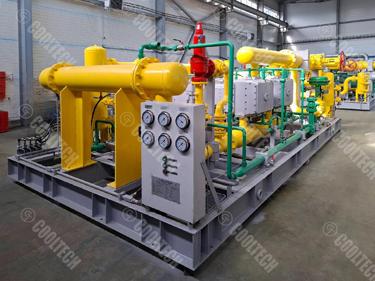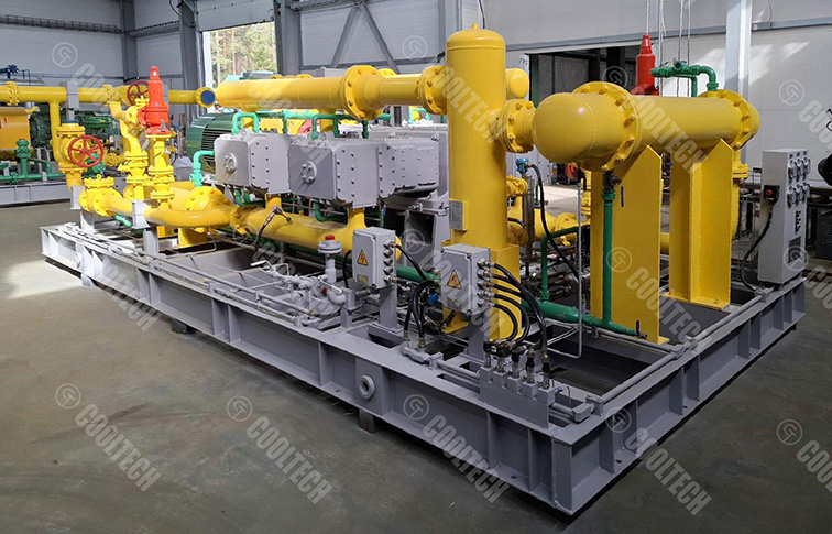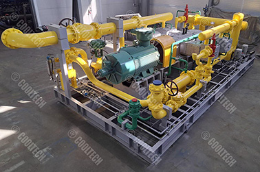 Взрывозащищенный компрессорный агрегат для перекачки углеводородного газа (обедненная бутиленовая фракция). Номинальный объёмный расход 33.4 м3/мин, мощность главного электродвигателя 250 кВт.